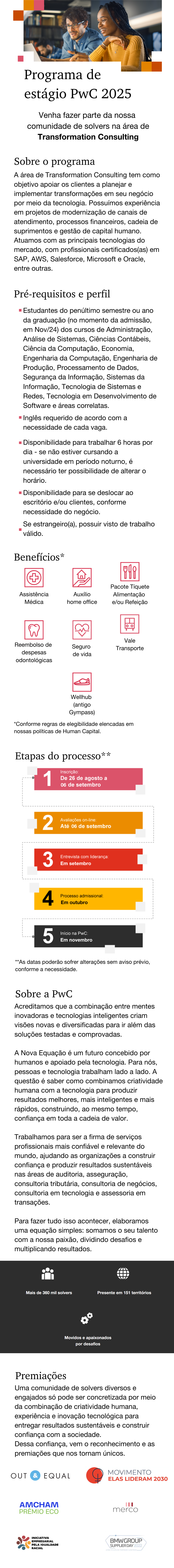 Na PwC, você tem a chance de começar a sua carreira em uma comunidade de solvers que respeita a sua individualidade, valoriza a inclusão e diversidade e entrega excelência e valor para a sociedade, combinando criatividade, paixão e experiência com o melhor da tecnologia.