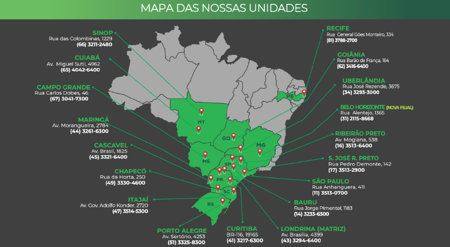 Com sua matriz estabelecida em Londrina, no Paraná, a Leão conta com 19 unidades distribuídas estrategicamente nas principais cidades dos estados de São Paulo, Paraná, Santa Catarina, Rio Grande do Sul, Mato Grosso, Mato Grosso do Sul e Goiás.
